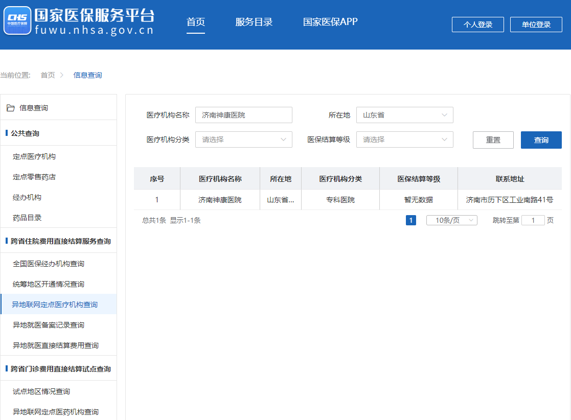 国家医疗保障局官网查询:济南神康医院为异地就医全国联网医院,异地定点医疗机构
